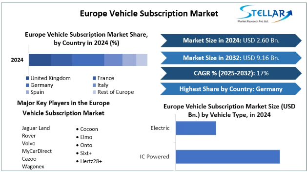 Stellar Market Research, a leading business consultancy firm, has published an in-depth analysis of the Europe Vehicle Subscription Market, offering valuable insights and projections. This detailed study covers critical business intelligence, demand analysis, pricing strategies, competitive landscape, and key growth drivers, providing a comprehensive view of the Europe Vehicle Subscription market's current state and its future potential.
