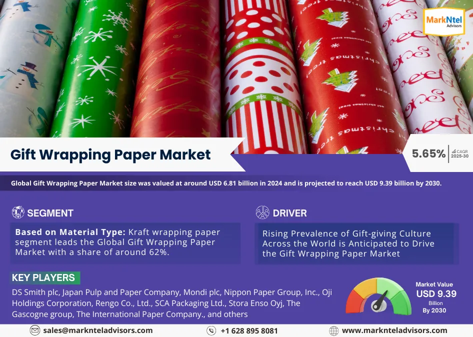 As per MarkNtel Advisors the Gift Wrapping Paper Market size was valued at around USD 6.81 billion in 2024 and is projected to reach USD 9.39 billion by 2030. Along with this, the market is estimated to grow at a CAGR of around 5.65% during the forecast period, i.e., 2025-30.