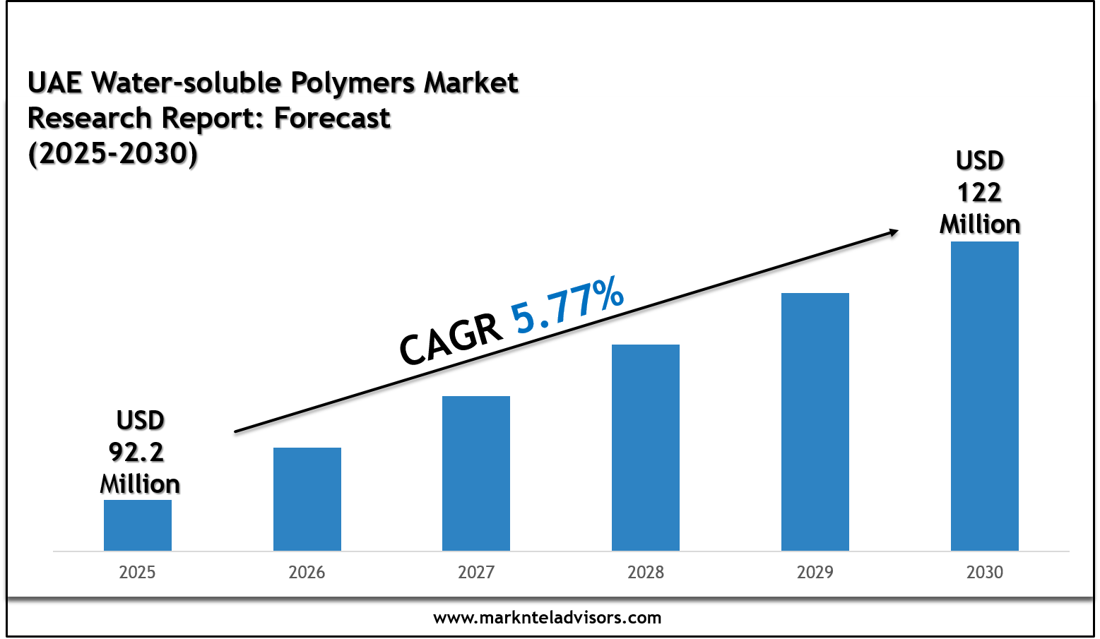 The UAE Water-soluble Polymers Market size is valued at around USD 92.2 million in 2025 and is projected to reach USD 122 million by 2030. Along with this, the market is estimated to grow at a CAGR of around 5.77% during the forecast period, i.e., 2025-30. The UAE Water-soluble Polymers Market is significantly growing due to several growth factors, including the high demand from water desalination and treating activities in the market, the aging oil & gas reservoir infrastructure, the oil recovery from deep oil wells, the rising paper and pulp industry to solve the problems like dewatering & water retention, and the adoption of green and bio-based water-soluble polymers.